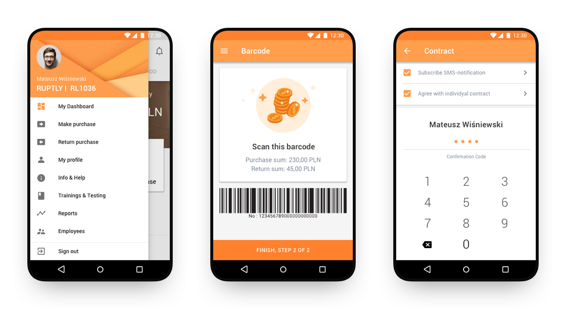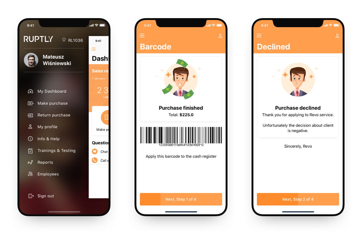 Приложение для партнеров Рево, которое предоставляет следующие возможности: оформление покупок с помощью Рево, оформление возвратов, просмотр статистики и отчетов по продажам, управление личными данными сотрудников.